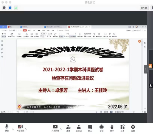 在腾讯会议平台召开了2021-2022学年第二学期期末考试专题培训会,马克思主义学院全体专任教师参加了此次培训会。此次专题培训会由马克思主义学院卓承芳副院长主持。