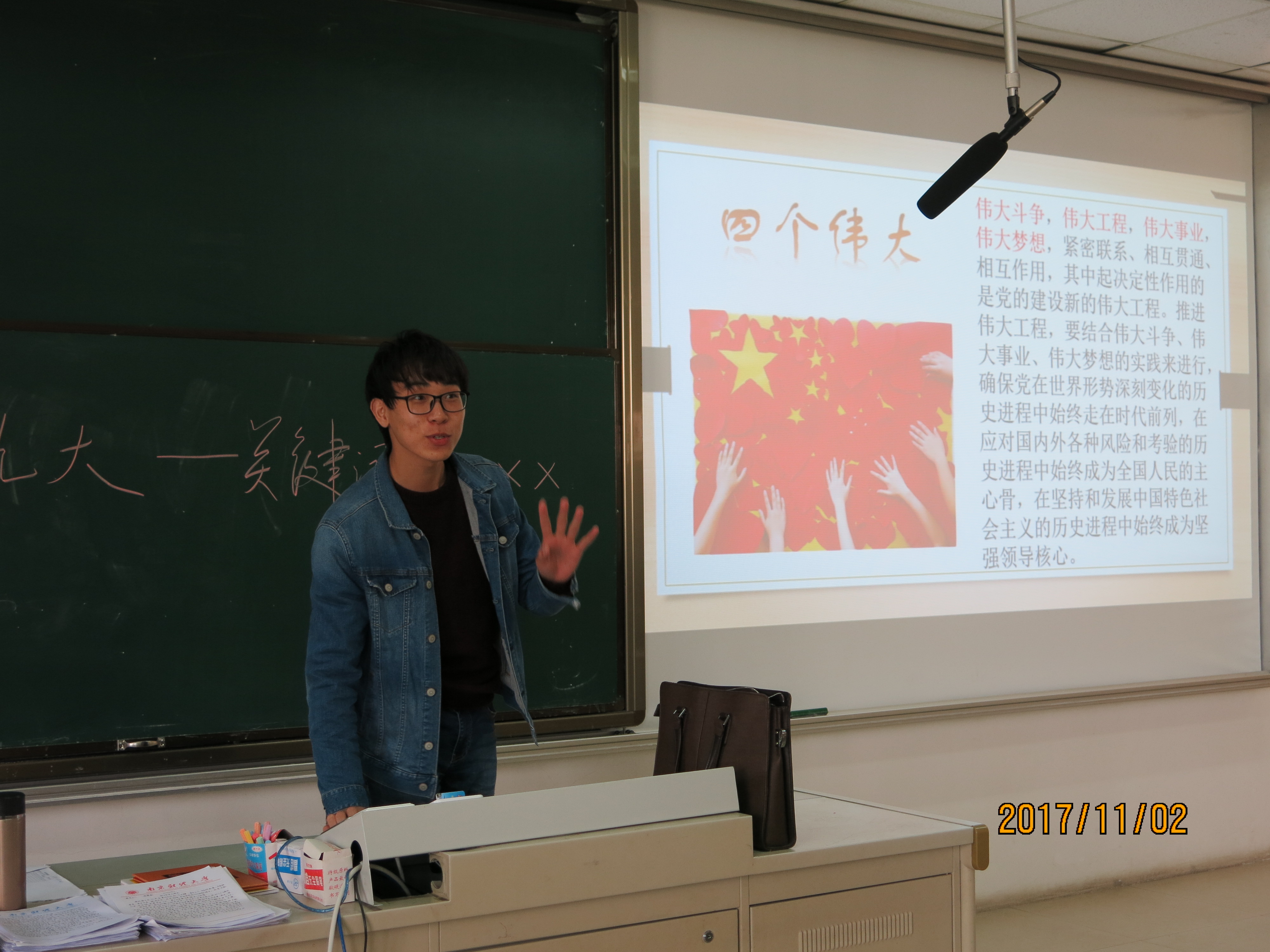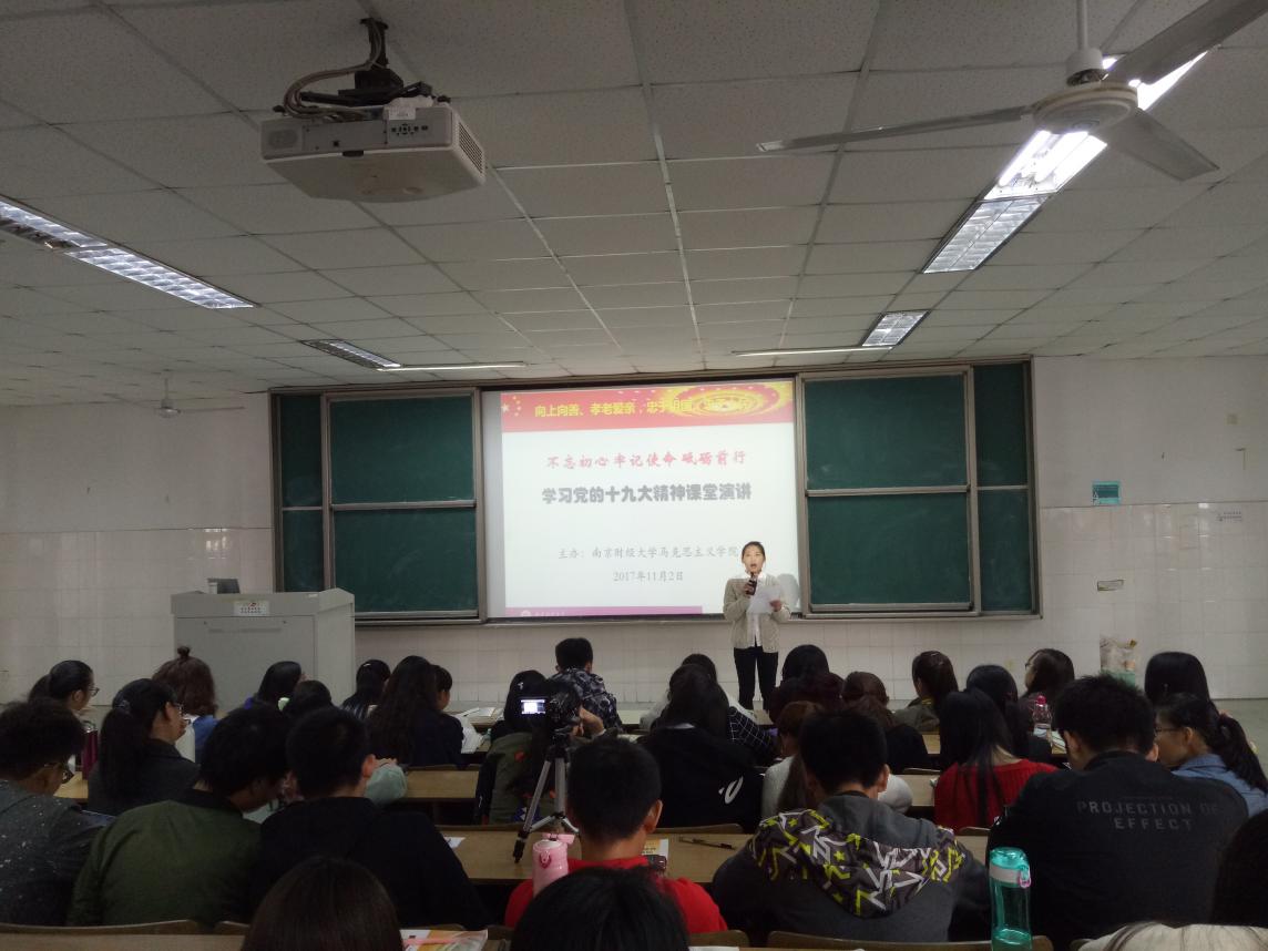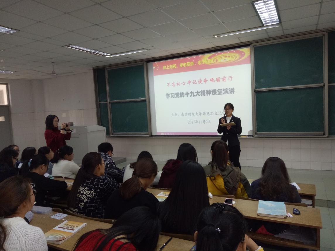 《思想道德修养与法律基础》的任课教师耿步健同样举办了一场精彩的“学习党的十九大精神课堂演讲”活动。本次演讲活动配合教材第二章“弘扬中国精神共筑精神家园”展开,演讲活动的主题是“向上向善、孝老爱亲、忠于祖国、忠于人民,不忘初心、牢记使命、砥砺前行”。为了保证本次演讲的效果,耿老师早在党的十九大召开前一周就开始布置,并多次审阅部分学生的演讲稿,党的十九大召开后,还及时要求参加课堂演讲比赛的同学将党的十九大报告中的相关内容和精神融入本人的演讲中。在课堂演讲比赛的整个过程中,所有同学都认真聆听每一个精心准备的演讲,并不时的给予热烈的掌声,使整个课堂充满爱党、爱国、爱人民、爱中国特色社会主义的浓烈氛围。