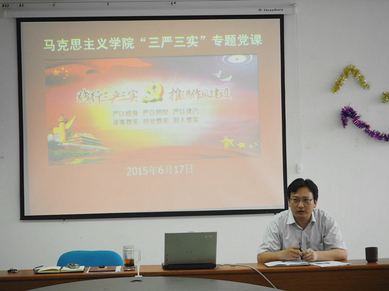 在院会议室举办“三严三实”专题党课暨“三严三实”专题教育布署会。学院科级以上领导干部、党总支委员、教职工党支部委员、教研室主任、分工会委员、校教代会代表等参加会议。院党总支书记殷建新以“践行三严三实,推进作风建设”为题上了一次专题党课。