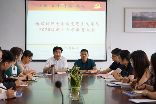 梅景辉院长首先对2020级新生的到来表示祝贺及欢迎,并简要介绍了学校及学院的历史与概况。他指出,在学校的大力支持下,学院老师团结一致,奋发进取,学院整体发展势头良好,教研工作水平稳步前进、蒸蒸日上。随后,他深刻阐述学院的人才培养理念,将其概括为“五者、六马、两经”,并进一步“五者”诠释为三个层次:一是研究生培养的核心层,要求马院研究生争当马克思主义理论研究的创新者、社会主义核心价值观的弘扬者;二是研究生培养的“保护带”,要求马院研究生成为中国优秀传统文化的传承者、现代科技文明的开拓者;三是研究生培养的“显示器”,要求马院研究生争做新时代思想政治工作的引领者。关于如何做到“五者”,梅院长强调要坚持四个回归,回归经典著作、回归生活世界、回归初心梦想、回归时代之问,树立学科自信、学术自信、文化自信、生活自信。要博学、审问、慎思、明辨、笃行,做到“知行合一”。最后,梅景辉院长对在座研究生提出了四点要求:一是要崇尚学术,掌握好学习方法,潜心问学;二是要自律自立,遵守规章;三是新生要积极融入团队,老生要做好引领示范和“传帮带”工作;四是要主动作为,通过积极参与文化实践活动来不断提升自身的综合素质。