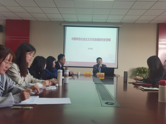 院长助理范渊凯老师以中国特色社会主义文化自信的历史逻辑为题,阐释了文化自信的内容,以及社会主义先进文化的内涵,并号召大家坚定文化自信。