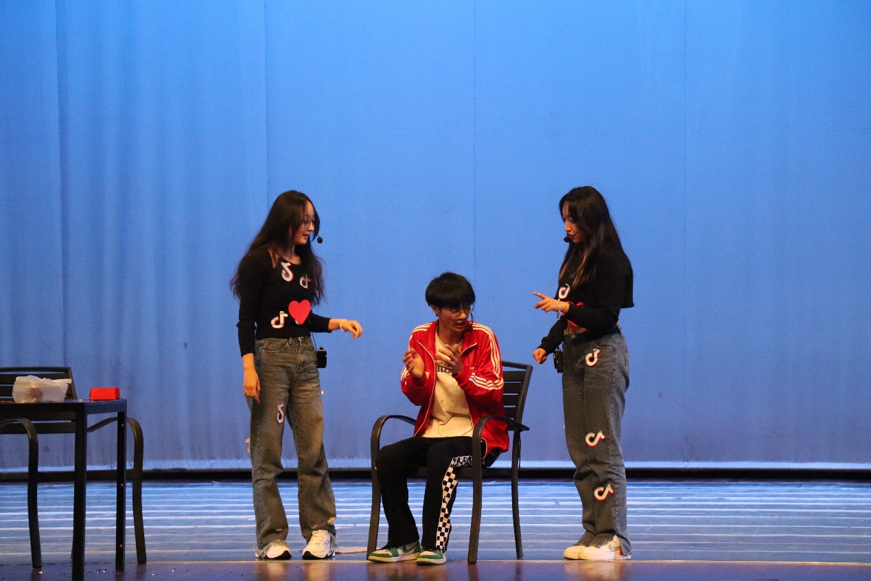 比赛中,同学们将不文明的社会现象以及社会热点问题搬上舞台,旨在教育大学生们养成良好的道德品质、树立健全的法治意识。其中,作品《相亲相爱一家人》提倡换位思考、相互理解,将社区营造为大家共同的家园。作品《蹭》用三位“大师”从辉煌到跌下神坛的故事呼吁市场商家诚实守信,共同维护良好的市场环境。作品《谁杀死了周日》揭示了拖延作风成为同事之间矛盾产生的导火线,并给日常工作造成了不必要的麻烦。作品《谁偷走了时间》让我们深刻感受到时光荏苒如白驹过隙,往事依稀若素月留空,不应让时间在不知不觉中悄然流逝……8个小品内容精彩纷呈,弘扬正能量,为同学们树立了正确的价值观导向。在近两个小时的赛程中,全场座无虚席,气氛热烈,掌声、笑声此起彼伏。