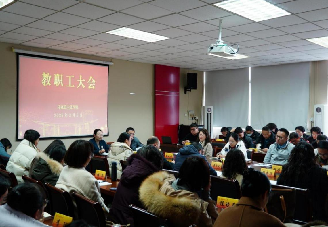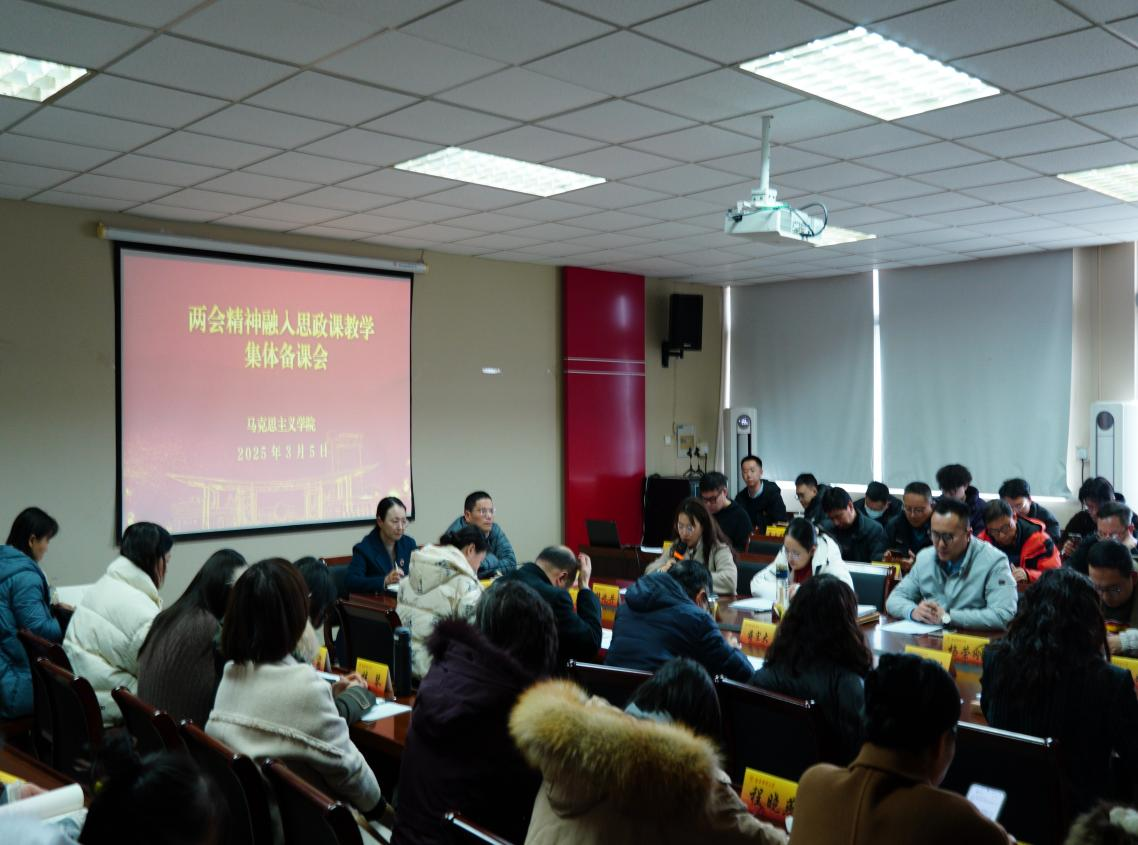 在德正楼508会议室召开两会精神融入思政课教学集体备课会与教职工大会,学院全体教职工参加会议。