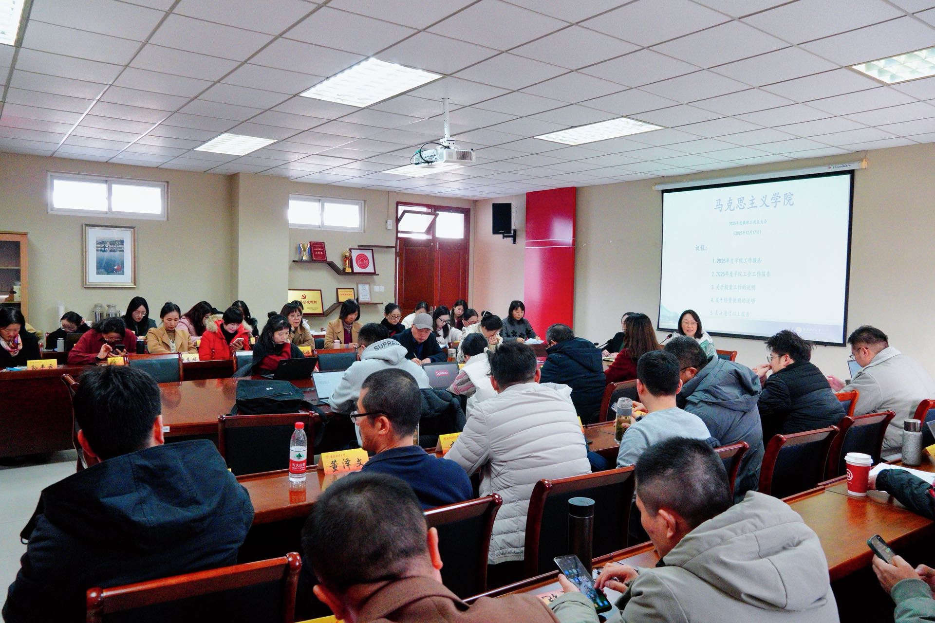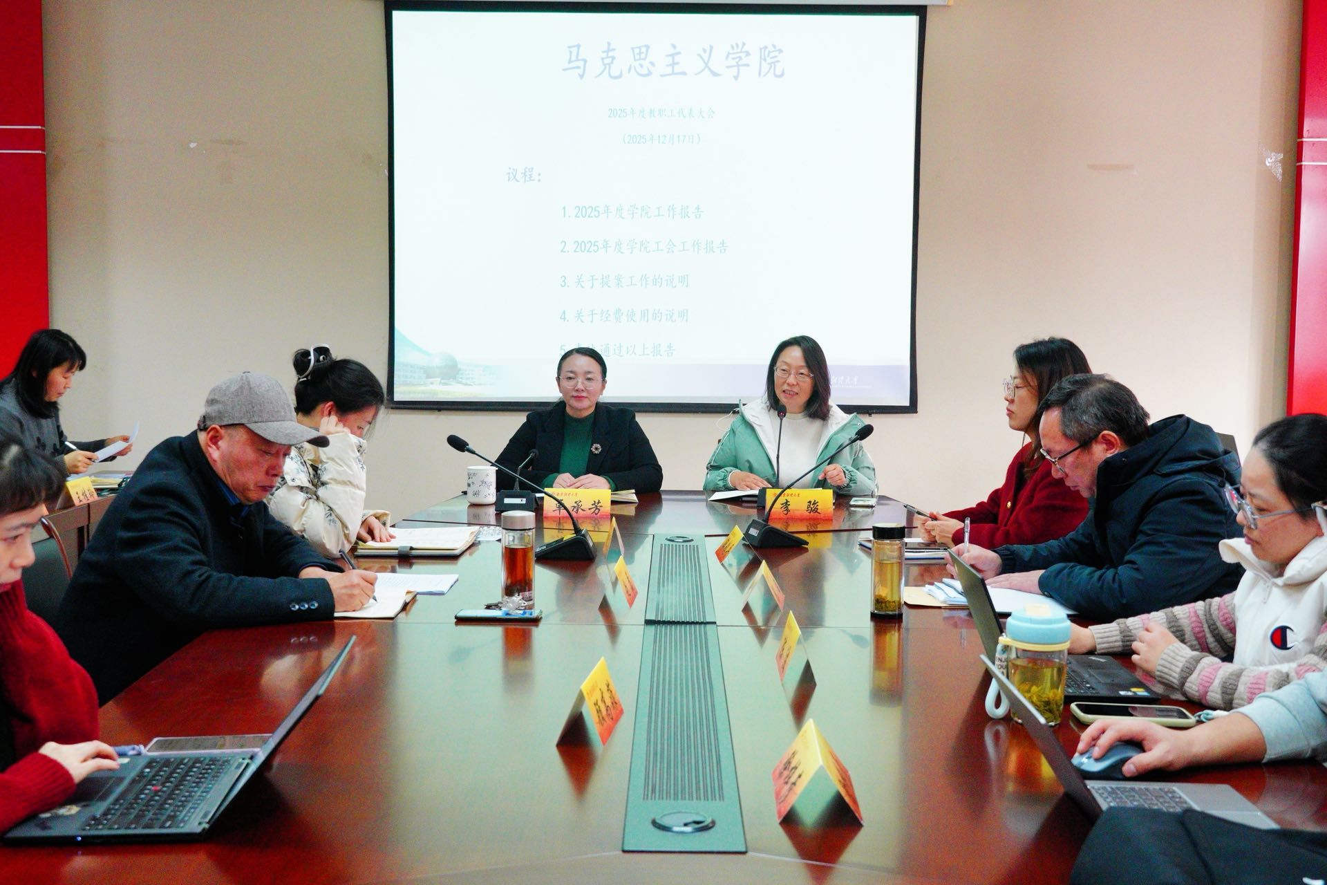 会议第一阶段分为五项议程。第一议程为卓承芳院长从教学、科研、师资队伍建设、研究生培养与管理等方面对2025年度学院工作报告进行了汇报。第二议程为学院分工会主席赵磊对2025年度学院分工会工作、分工会经费使用情况作详细报告。第三议程,李骏书记围绕教代会提案工作作说明,鼓励全体教师积极参与学院发展意见的提案。第四议程,院综合办公室对2025年度学院经费使用作了汇报。第五议程,全体教职工对2025年度学院工作报告、分工会报告、学院经费使用总体情况进行表决,全体通过。