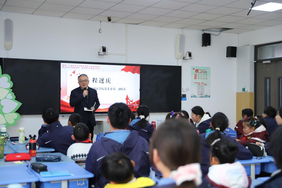 展示结束后,南京仙林外国语学校党委委员、副校长程迓庆作了深刻总结。他指出,推进大中小学思政教育一体化建设,要做到“各美其美、美美与共”,本次集体授课从空间上的接近带来了心灵上的相通,注重从“理与例、导与悟、浅与深”三个范畴上把握马克思主义科学方法论与思政课教学的有机结合,并从六个方面生动描绘了他心目中理想的思政课。最后,程校长以《少年中国说》作结,寄予时代青年殷殷期望和嘱托。