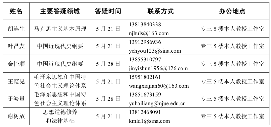 注:由于各种原因,参加答疑的教授可能会临时有事,请前来请求答疑的同学先用短信联系要求答疑的教授,待双方就时间和地点达成一致后再进行。另外,欢迎在学习中有疑问的同学也可以将问题发到要求答疑的教授的邮箱中,我们的教授一定会耐心给你回复并解答。在发邮件时请同时给要求答疑的教授发信息,提醒要求答疑的教授查阅本人邮箱,并予以解答和回复。