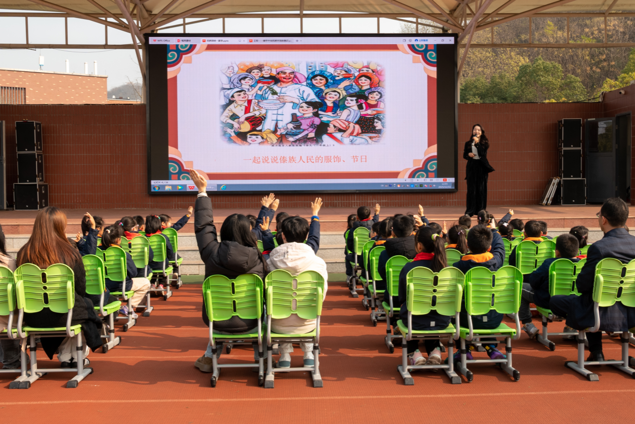 活动在庄严而温馨的氛围中拉开序幕。师生们首先通过大屏幕共同观看了一系列展现我国各民族风貌的视频与图文介绍。从雪域高原到江南水乡,从辽阔草原到边陲村寨,多彩的民族文化、共同的家国情怀,深深吸引着每一双专注的眼睛。随后的互动问答环节,大孩子、小孩子们踊跃发言,在轻松愉悦的交流中进一步理解了“中华民族一家亲”的深刻意义。