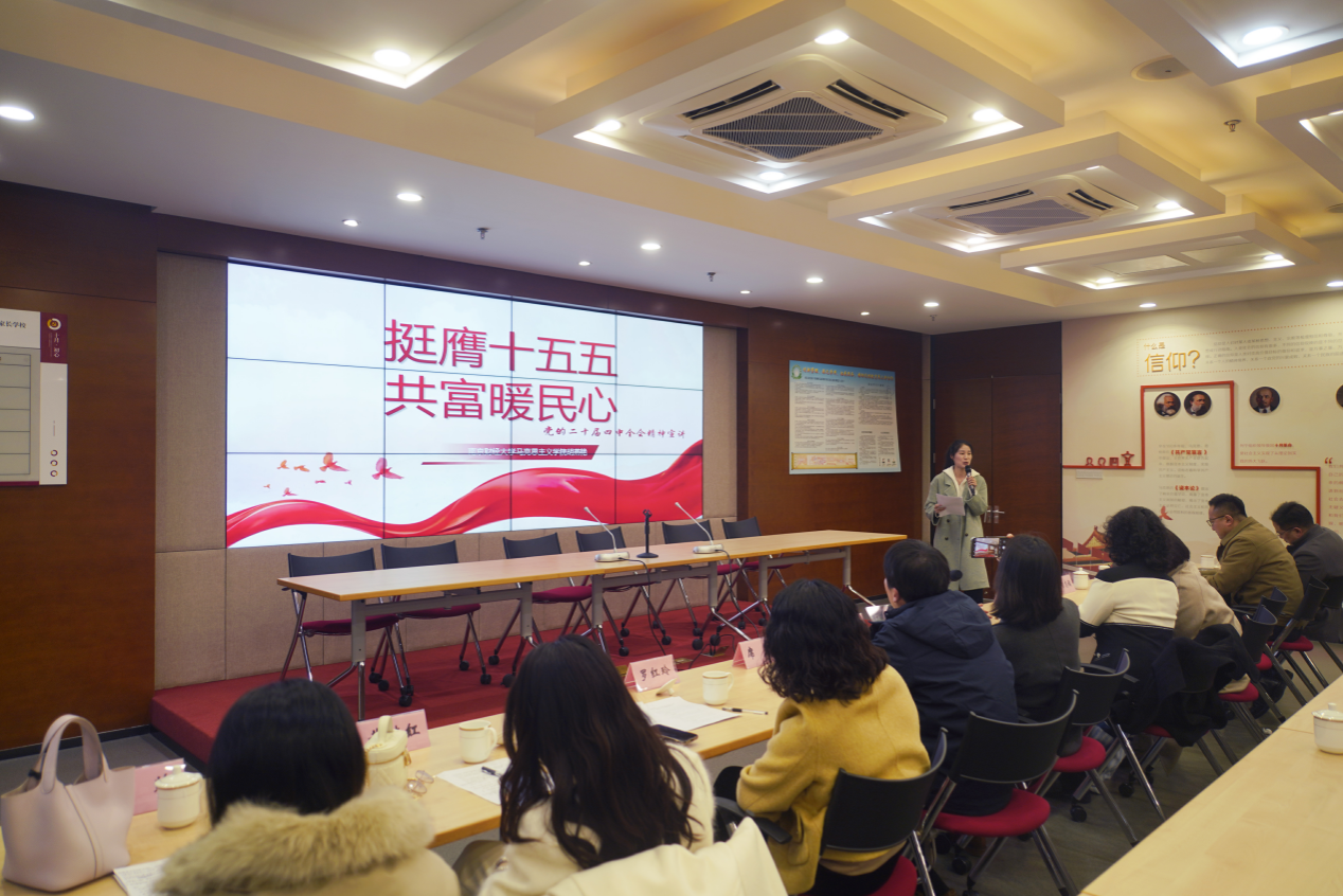 南财马院学生代表朱传仿、王军结合讲解分享学习感悟,教师党员李飞现场点评补充,让在场人员深刻领会到这一思想的历史根基与现实价值,也为后续理论宣讲筑牢了实践基础。