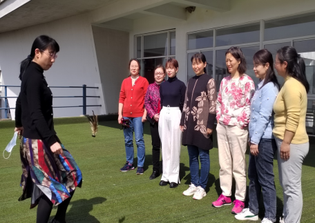 天气晴朗,春风荡漾,女教师们放松心情,交流体会,有的远眺校园美景,有的认真进行练习。