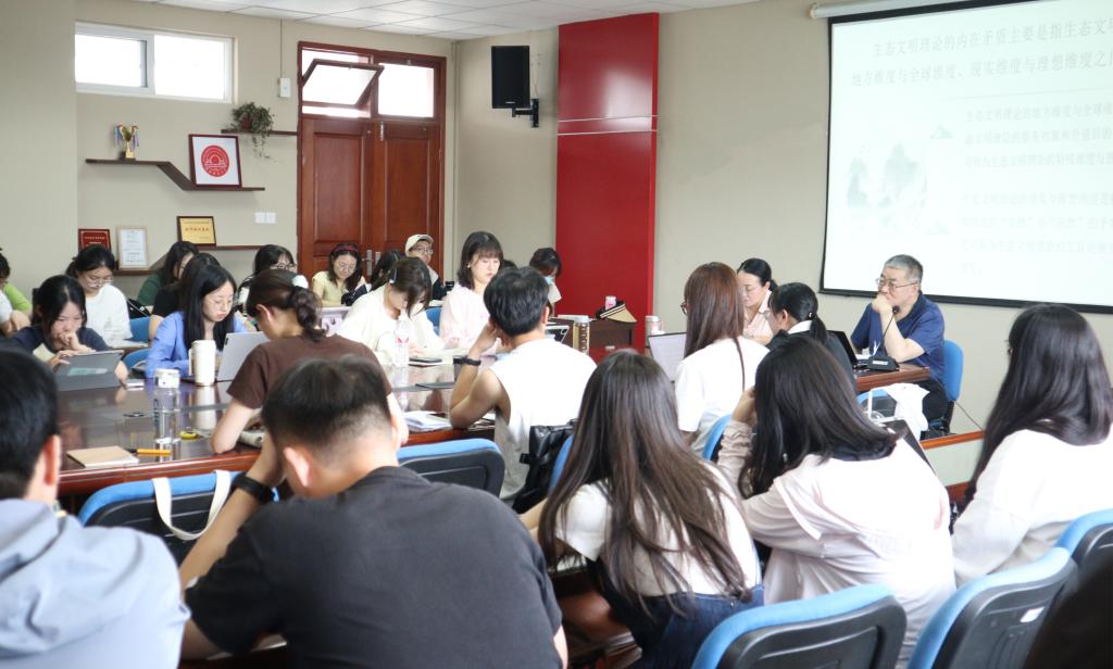王雨辰教授围绕生态文明理论的内在矛盾、习近平生态文明思想的原创性贡献及其当代价值等方面进行了详细阐述。首先,王教授带领同学们回顾了西方生态思潮的形成与发展,介绍了西方“浅绿”“深绿”“红绿”三大生态思潮,并评价了它们的历史局限性。其次,王教授基于大历史观的视野,指出生态文明理论的内在矛盾主要表现为生态文明理论的地方维度与全球维度、现实维度与理想维度之间的矛盾,并指出西方生态思潮都曾意识到生态文明理论的内在矛盾,但都未能提出有效解决办法。再次,王教授阐释了习近平生态文明思想对生态文明理论内在矛盾的科学解决,从方法论、价值论维度提出了构建社会主义生态文明理论的必要性与紧迫性。