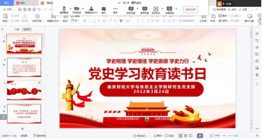 为进一步落实党史学习教育工作,推进党史学习常态化。3月24日,研究生党支部通过腾讯会议线上开展以“用好有利条件,走好必由之路”学习习近平总书记2022年全国两会重要讲话精神为主题的党史学习教育读书日主题党日活动。会议由研究生党支部书记毛莉主持,支部全体党员参会。