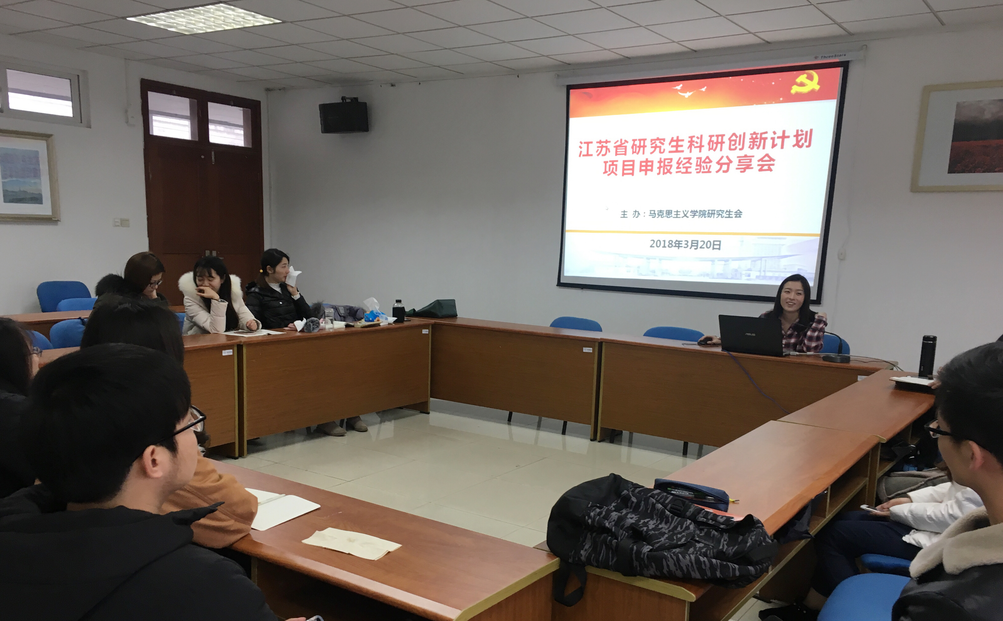 于学院会议室举办了“2018年度江苏省研究生科研创新计划项目”申报经验分享会。会议邀请2016级成功申报省立省助项目的莫菲、彭见欢、彭婷、屈文锦四位同学担任主讲,2017级意向申报省级课题的同学参加了会议,会议由91吃瓜